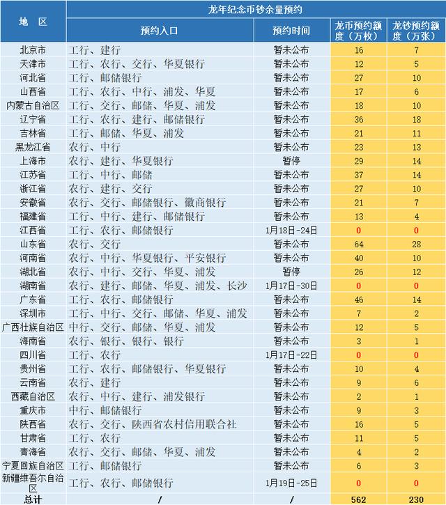 一共230万张龙钞和562万枚龙币,马上就要开始预约了。(www.ws46.coM) 它们的关注度也高了起来,经常有藏友问起预约相关信息。 百科网要提醒的是,目前还没有具体的预约安排公布,但从测试页面中,我们已经可以提前知晓,龙年币钞是线上预约,龙币和龙钞将在同一日分批预约。 各地额度和预约银行,已经整理好了。