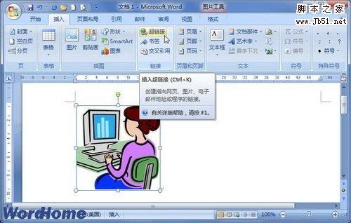 在Word2007文档中,用户不仅可以创建文本超链接、图片超链接,还可以创建剪贴画超链接或艺术字超链接,具体操作步骤如下所述: 第1步,打开Word2007文档窗口,单击选中艺术字或剪贴画。切换到“插入”功能区,在“链接”分组中单击“超链接”按钮,如图2011110221所示。