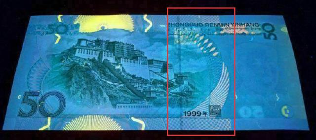 红光麒麟是纸币背面的左侧,多出了红色的鳞状红色荧光。 两者都算是比较明显的,它们能翻个10倍左右,值得大家多多留意了! 最后一种是瑕疵币。 文章开头提到的,拍了7200美元的99年50元,就是一种瑕疵币,它们的币面直接就和正常纸币不同。