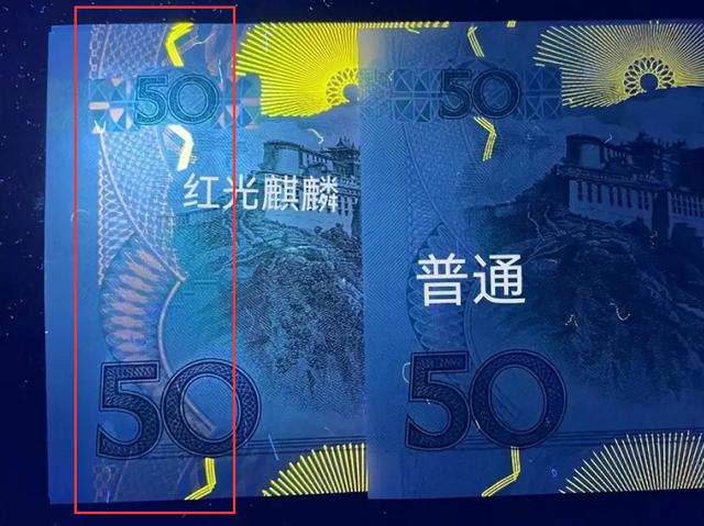 比如上面这两刀看起来平平无奇的99年50元,其中拥有很多倒置号,报价就达到3.4万! 第三种,就是2种特殊的荧光了。 它们的名字听起来就不太普通,分别叫金光神鹰和红光麒麟。 这两种荧光版别,自然需要在荧光灯下才能发现。