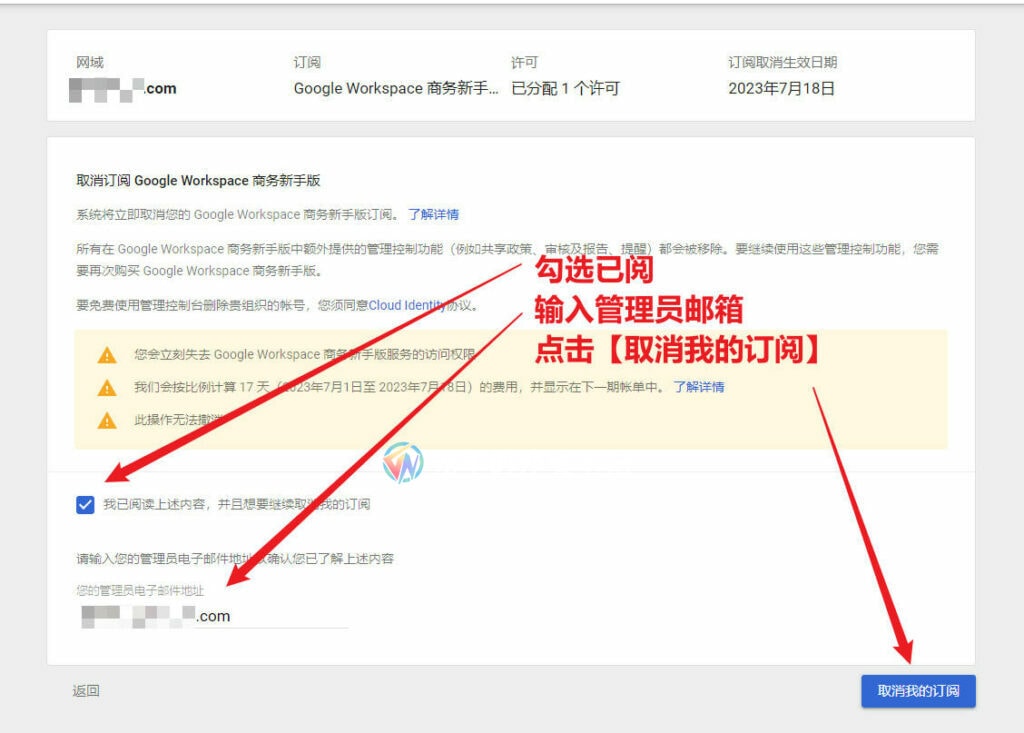 6.确定【取消我的订阅】这里勾选已阅,输入管理员邮箱。在我们确定取消订阅后,我们会失去此付费邮箱的访问权限。所以请再次确定你已经备份了重要资料。另外到期前的已付费用会按照未使用的时间退还。