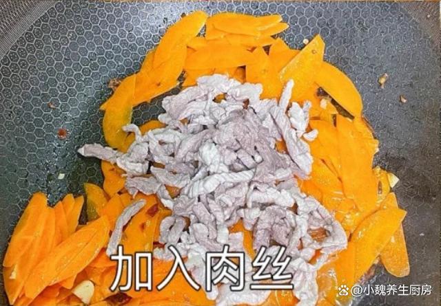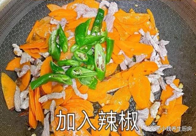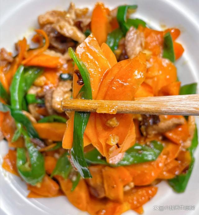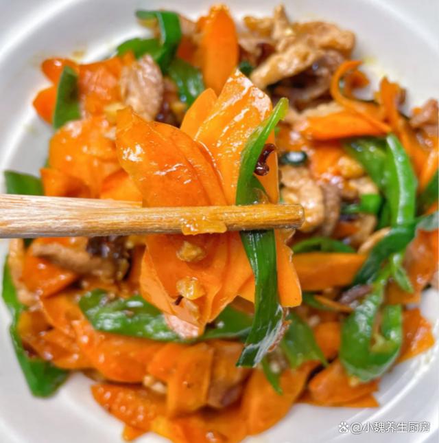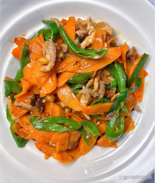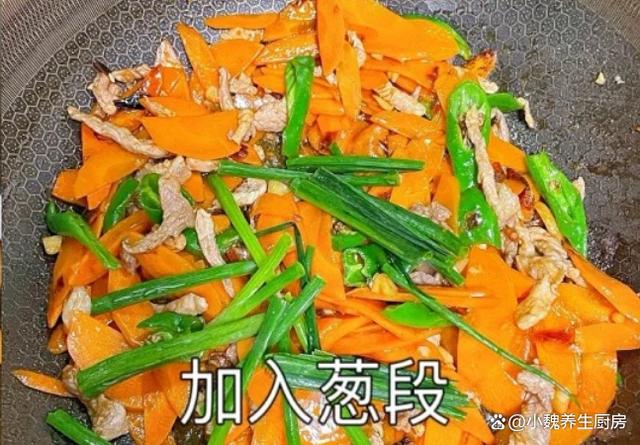 深秋到了尾声,马上就迎来冬天,冬天的天气慢慢变冷,很多时候外面都很冷,天冷就不想出门吃饭,外卖吃起来也并不健康,所以会提前准备食材,每周都会囤积一些食材,比如说肉类,萝卜和白菜。现在正是萝卜上市的时候,价格都很便宜,今天准备用胡萝卜搭配猪肉制作一道家常菜肴——青椒胡萝卜炒肉丝,菜色非常好看,好吃不腻。冬天,这菜要岔着吃!荤素搭配,解馋开胃,补充营养度过寒冬。  【青椒胡萝卜炒肉丝的正确做法】 准备一些食材:选购两根新鲜胡萝卜(胡萝卜是秋冬最受欢迎的蔬菜,外皮要光滑,色泽要鲜艳,捏起来有硬度,这样的水分很足,口感和营养价值更高,如果是用来炒着吃,不要选择太粗的胡萝卜,这样的口感更加清甜一些),几个干辣椒,大蒜坨若干个,少许食用油,几片生姜,少许清水,食盐和白糖少许,挑选新鲜猪肉半斤(猪肉是最常见的肉类,价格相对便宜,肉质鲜嫩,可以搭配任何食材一起吃),少许玉米淀粉,生抽和蚝油若干,一小勺白糖,食盐少许,鸡精和胡椒粉若干,几个青椒,几根新鲜小葱,其他。 正确制作过程:1:提前准备好青椒,胡萝卜和猪肉等食材,将青椒的顶部按压,挖出里面的青椒籽,洗净后切成细丝。2:两根胡萝卜都洗干净,方便快速去皮,切成若干片状,锅中煮一小锅清水,倒入胡萝卜焯烫一会儿,这样不仅仅不会降低食材的营养,口感还非常脆嫩。3:香葱洗净切成段,几片生姜切成细丝,干辣椒洗净切成小段,大蒜去皮切成蒜末,备用。4:提前把猪肉处理干净,瘦肉顺纹切片,然后切成细丝,全部放在容器中,加上少许料酒去腥,加上生抽和蚝油半勺,加上玉米淀粉半勺,将瘦肉丝充分抓拌均匀,腌制入味。 5:锅底提前烧热乎,加上冷油烧热,滑入腌制入味的瘦肉丝,快速大火煸炒,炒至色泽变色,盛出即可。