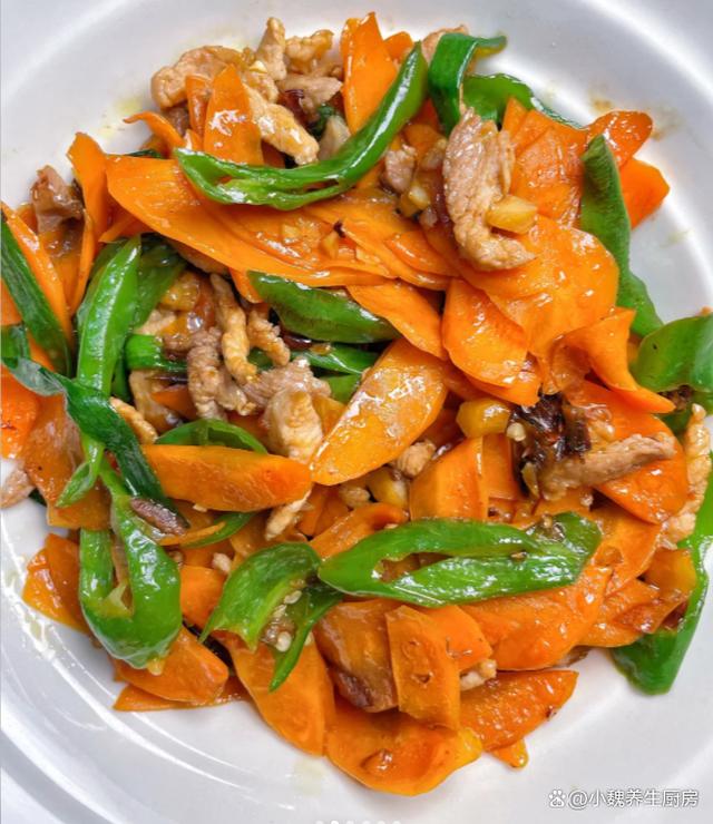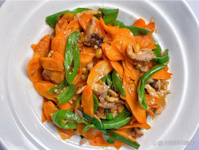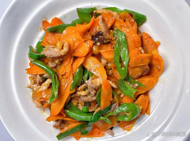 摘自: www.ws46.com 7:最后倒入炒熟的肉丝,放入一些青椒丝和葱段,加上半勺白糖和食盐,加上鸡精和其他佐料,快速翻炒几下,装盘出锅,这道青椒胡萝卜炒肉丝就出锅了。 青椒胡萝卜炒肉丝的制作小贴士:首先,切工要精细。青椒切成细丝,胡萝卜要切成片状,这样不仅能加快烹饪时间,还能使食材更易于入味,口感也更加脆爽。肉丝则需顺着纹理切,这样炒出来的肉丝不易碎,口感更加鲜嫩。其次,火候是关键。炒这道菜时,应先大火快炒肉丝至变色,锁住肉汁,然后迅速加入青椒和胡萝卜丝,转中火翻炒。这样既能保证肉丝的鲜嫩,又能使蔬菜保持脆嫩的口感和鲜艳的颜色。 再者,调味要适量。生抽、老抽、盐和糖的比例需根据个人口味进行调整。生抽提鲜,老抽上色,盐和糖则平衡整体风味。建议在加入蔬菜丝后再调味,这样可以使食材更均匀地吸收调味料。此外,根据个人喜好,还可以加入蒜末、姜末等调料,增添菜肴的香气。若喜欢微辣口感,可在炒肉丝时加入适量辣椒丝。 掌握了这些小贴士,相信你能轻松做出一道色香味俱佳的青椒胡萝卜炒肉丝,让家人和朋友都赞不绝口。各位网友们,你们是否吃过这道青椒胡萝卜炒肉丝吗?(上述配图都出自网络)