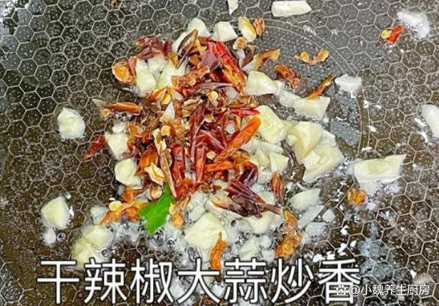6:锅底留少许油,加上干辣椒,蒜末,葱花和蒜末爆香,倒入胡萝卜片,将其炒至断生。