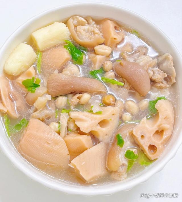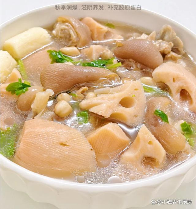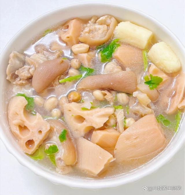 (www.ws46.Com) 6:让食材炖到熟透,汤色变成奶白色,加上葱花或香菜,加上食盐和白胡椒粉,将汤品调味,炖煮两分钟即可,出锅享用。 山药黄豆炖猪蹄汤的食用禁忌:首先,对于体内湿热较重、痰火壅盛的人来说,此汤应谨慎食用。山药虽能健脾益肾,但其性质偏温,与同样性平的猪蹄和黄豆一同炖煮,可能加重体内湿热,不利于病情恢复。 此外,孕妇在食用时也需谨慎。虽然猪蹄中的胶原蛋白有助于胎儿皮肤发育,但过量摄入可能导致体重增长过快,增加妊娠风险。建议孕妇在医生或营养师的指导下适量食用。综上所述,山药黄豆炖猪蹄汤虽好,但并非人人皆宜。在食用前,应根据自身健康状况合理搭配,适量食用,方能真正发挥其滋补养生的功效。 山药黄豆炖猪蹄汤是一款特别温补的靓汤,里面包括山药,莲藕,黄豆和猪蹄,全是高营养的食材,简单炖一锅,营养都融入汤品里,鲜美清甜,滋补气血,还可改善肾脏功能,气色越来越好。各位网友们,你们有没有掌握这款山药黄豆炖猪蹄汤的正确做法吗?(本文配图都出自网络)