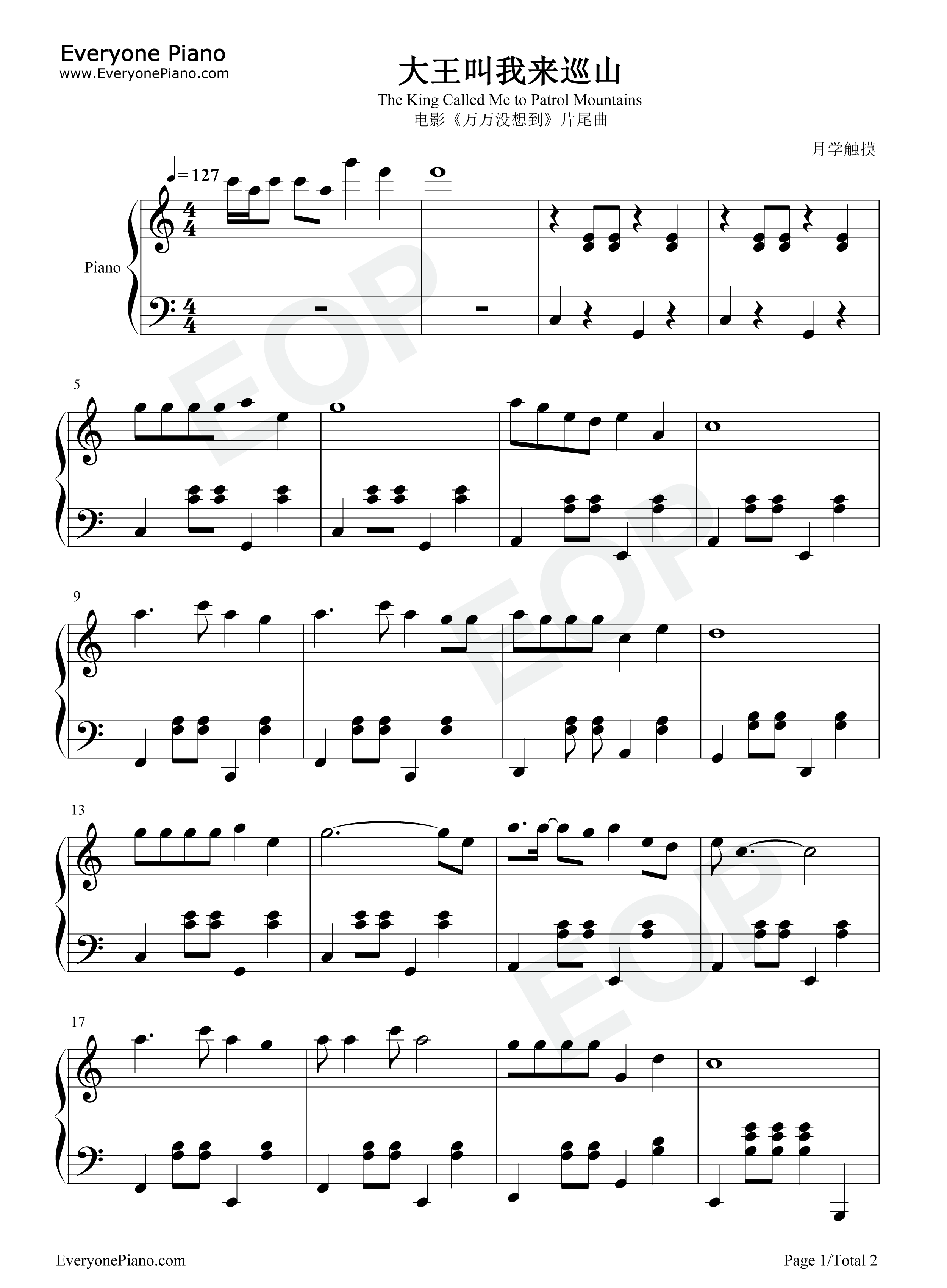 是电影《万万没想到:西游篇》片尾曲,由贾乃亮、甜馨父女演唱,赵英俊作词作曲。“10后西游粉”甜馨惊喜圆梦,化身妖精大王,贾乃亮则变身跟班小妖,大跳欢乐巡山舞。首度献声的甜馨自创“最萌RAP”唱法,连爆搞怪金句,萌出新高度!电影《万万没想到:西游篇》将于12月18日献映。 大王叫我来巡山MV中,贾乃亮、白客和子墨则化身“巡山队”,跳起了巡山舞,贱萌舞步让人捧腹不已,其中翘腿等动作更是“娘帅娘帅的”,相当魔性。此外,词曲作者赵英俊在片中的打鼓小妖形象也随之曝光,也曝光了部分爱情片段,白客饰演的王大锤对杨子姗饰演的小美展开疯狂追求,“变花”献给自己的“小公举”,意外获得女神“熊抱”,十分幸福。马天宇饰演的情敌慕容白则首度以绿衣造型现身,长发飘飘,回眸瞬间尽显妩媚气质,让人不禁好奇。 歌词下方是大王叫我来巡山钢琴谱,希望大家喜欢。 大王叫我来巡山歌词: 亮:太阳对我眨眼睛 鸟儿唱歌给我听 我是一个努力干活儿 还不粘人的小妖精 别问我从哪里来 也别问我到哪里去 我要摘下最美的花儿 献给我的小公举 大王叫我来巡山 我把人间转一转 打起我的鼓 敲起我的锣 生活充满节奏感 大王叫我来巡山 抓个和尚做晚餐 这山涧的水 无比的甜 不羡鸳鸯不羡仙 馨:太阳对我眨眼睛 鸟儿唱歌给我听 亮:我是一个努力干活儿 还不粘人的 合:小妖精 馨:别问我从哪里来 也别问我到哪儿去 亮:我要摘下最美的花儿 献给我的小公举 大王叫我来巡山 我把人间转一转 打起我的鼓 敲起我的锣 生活充满节奏感 大王叫我来巡山 抓个和尚做晚餐 这山涧的水 无比的甜 不羡鸳鸯不羡仙 大王 大王叫我来巡山 大王 大王叫我来巡山 大王 大王叫我来巡山 大王 大王他叫我来巡山 大王叫我来巡山 我把人间转一转 打起我的鼓 敲起我的锣 生活充满节奏感 大王叫我来巡山 抓个和尚做晚餐 这山涧的水 无比的甜 不羡鸳鸯不羡仙 |