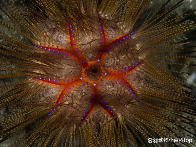 长刺海胆,又被戏称为“魔鬼海胆”,广泛分布于印度洋和西太平洋海域。这是一种体型较大的海胆,其内壳的直径可超过10厘米。整个身体呈黑色,中心位置有着红色的眼点,而黑色的棘刺长度可达15厘米以上。这些棘刺具有毒性,而且极易折断。一旦被刺到,疼痛感堪比蜂蜇。尽管长刺海胆看起来身形纤细,但它们擅长自我保护,并可与凶猛的鱼类共存,起到控制过多藻类生长的作用。 7、星肛海胆
