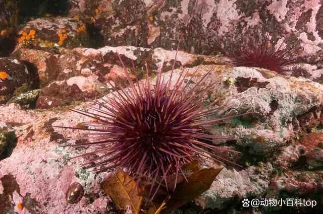 在海胆的品种大全中,绝对不能忽略著名的巨紫球海胆。这种海胆主要分布在太平洋海域的沿岸浅水区域和其他海洋环境中。巨紫球海胆的特点是其大胆壳呈球形,呈现出五辐对称的结构,每两列步带板与两列间步带板相间排列,同时具备亚里士多德提灯。它的胆壳直径大约为25厘米。体表颜色的范围广泛,可能呈现从红色、红棕色、砖红色、酒红色到深紫色等不同的色调。巨紫球海胆依靠身上的尖刺来保护自己,避免受到侵害。 6、长刺海胆