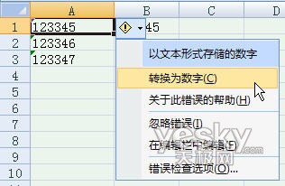 针对上述两种不同的转换方式,自然也有不同的逆转方法。 对于采用“设置单元格格式”方式设置的数字文本,我们一样采用选择单元格,点鼠标右键,从菜单中选择“设置单元格格式”,再从弹出菜单中的“数字”选项卡中选择“数值”即可。 对于采用添加半角引号方法数值的数字文本,我们可以这样操作: 选择单元格,单元格右边会出现黄色的“!”号提醒标志,提醒“此单元格中的数字为文本格式,或者是前面有撇号”,点击“!”号右边的小三角按钮。