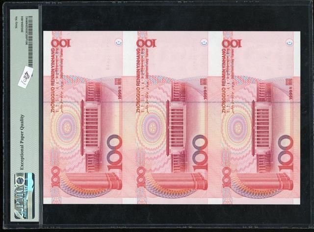 它是3张上下相连,没有经过裁切的1999年100元纸币。 这种礼品币是为了庆祝千禧年的到来而发行的。 它的发行数量更为稀少,只有20万册。