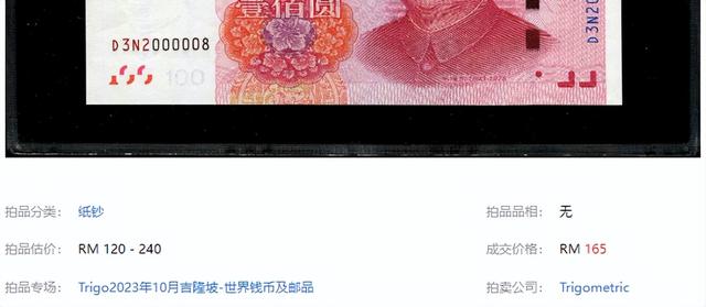 它们的数量都不少,想要有收藏价值的话,普通的纸币肯定不行,得有自己的独特之处。 对于我们普通人来说,最容易遇到的,也是最值得留意的,自然就是号码了。 靓号的100元在去年10月举办的Trigo吉隆坡拍卖会中,就出现了几张靓号的100元纸币,它们不少拍出了100多马来西亚林吉特。