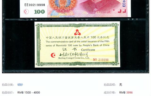 上面这一张首发币,就拍出了3996元。 注意,这种首发币有部分进入流通,我们想要寻找的话,留意EE开头的,号码是50万以内的100元纸币。 第二种是以三连体形式发行的世纪龙卡。