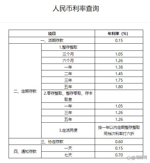 1、活期存款利率:目前邮政银行的活期存款年化利率为0.15%,这个存款利率算比较低了,因此对于追求高收益的投资者来说,活期存款不是最佳选择。 2、定期存款利率:邮政银行的定期存款利率根据存款方式和存款期限而有所差异,一般来说存款期限越长利率越高。 1)整存整取的定期存款年利率为1.05%~1.8%,其中三个月期为1.05%,六个月期为1.26%,一年期为1.38%,二年期为1.45%,三年期为1.75%,五年期为1.8%。(www.ws46.Com) 2)零存整取、整存零取、存本取息的定期存款年利率为1.05%~1.26%,其中一年期为1.05%,三年期为1.26%,五年期为1.26%。 3)定活两便存款年利率为按一年以内定期整存整取同档次利率打六折。 3、协定存款年利率为0.6%。 4、通知存款年利率为0.15%~0.7%,其中一天通知存款年利率为0.15%,七天通知存款年利率为0.7%。