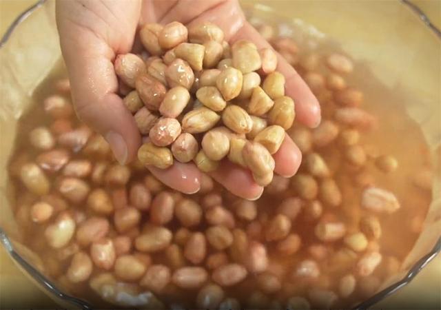 1.大家好,今天给大家分享个花生米的新吃法,不用水煮和油炸,不管是当零食还是下饭都不错,好吃还不容易上火。今天准备的花生品种是白沙,把那种变色的挑出来,倒入刚烧开的热水,把花生浸泡五分钟,泡好的花生表面会起皱,像这样就行了。