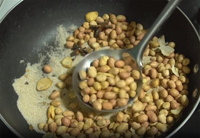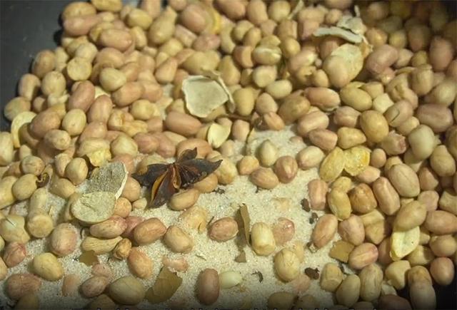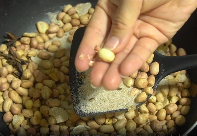 6.翻炒大约八分钟后,可以听到噼里啪啦的声音,这个时候转小火把里面的香料全部炒开,咱们的花生米就炒好了,拿起一个来用手轻轻一捏,外皮就去掉了,再用漏勺把花生米过滤一下。