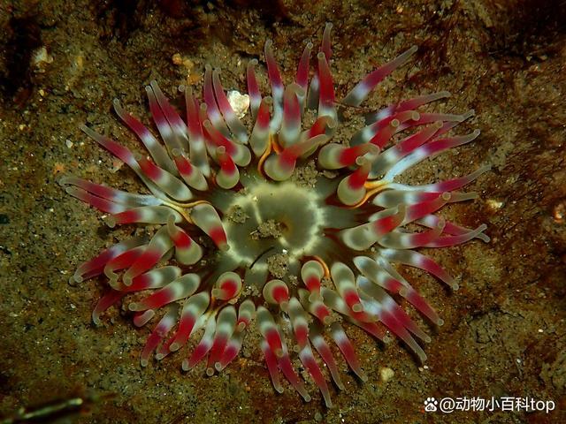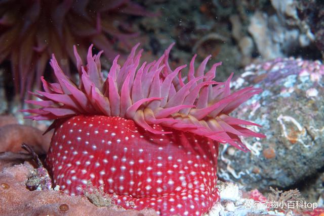 北美草莓海葵被认为是世界上最华丽的海葵之一,是一种独特而精美的大型海葵。其直径可达10厘米,长度长达15厘米,拥有奇特的肉状突起,主要以红色为主色调,表面覆盖着光滑的红色柱体,点缀着明亮的白色斑点,这些斑点呈直线排列。北美草莓海葵通常不会吸引砾石或贝壳碎片,并且没有刺痛的触手突出体壁,口盘呈普通红色,触角是红色的锥形,没有横向条纹。 3、美国海葵