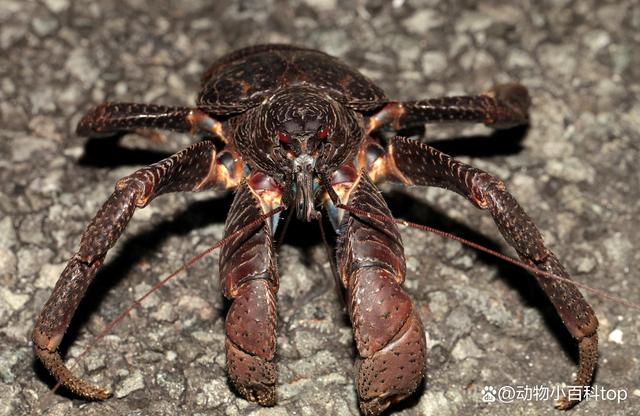 阿拉斯加帝王蟹,或称帝王蟹、石蟹、岩蟹,学名堪察加拟石蟹,隶属于十足目歪尾亚目石蟹科,外观类似于螃蟹,但严格来说并非正统螃蟹,更接近于寄居蟹。这种帝王蟹属于深海类蟹,主要栖息在寒冷海域,通常体重约为10千克,脚一经展开便可达1.8米。拥有强壮的长腿,因此是少数既能横行爬行又能竖行行走的螃蟹之一,名列全球最大螃蟹的前三位。由于其庞大体型和鲜美肉质,被广泛捕捉作为美食享用,因此常常在大型超市的冷冻区找得到帝王蟹的身影。 4、椰子蟹(最重可达8千克)