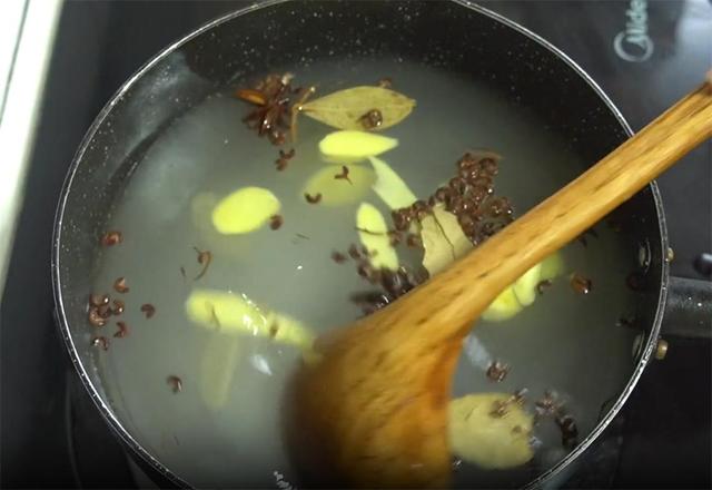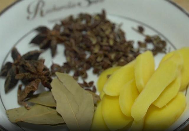 3.再准备点生姜切成片,香叶、三个八角和一小把花椒。