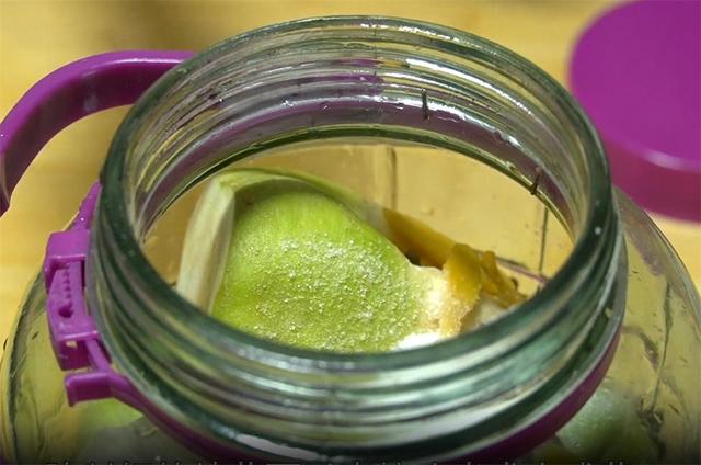 5.晾干水的辣菜装在一个干净没有生水和油的容器里,放凉的调料水全部倒进来,最后在表面撒上一层盐。