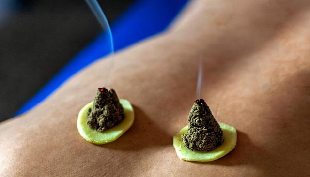 隔物灸:这种方法为间接灸,在艾火与皮肤之间放置隔热物,比如生姜、蒜、盐等,最常见的是隔姜灸,把新鲜的生姜切成2~3毫米的薄片,用牙签在中间扎一些小孔,再把艾绒放在姜片上点燃即可。
