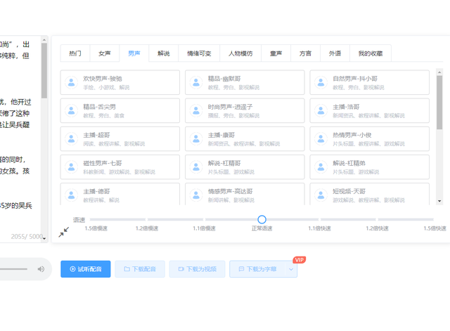 三、配音配音的话,看自己情况,如果你声音好听,找个耳机,照着你的稿子直接读下来即可。如果声音不行,那么就选择一些转换工具,转换即可。 现在这种文字转语音工具有很多,自己网上找找就好,我就不一个个推荐了,因为太多了。