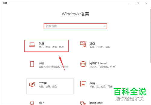 6. 在下图所示的Windows设置页面中,点击箭头所指的系统选项。