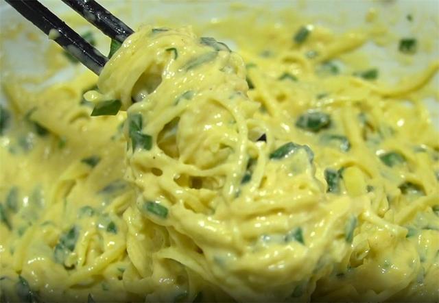 4.放到装土豆丝的碗里,分次加入适量的面粉和清水,每加一次就充分搅拌一下,大家用的菜量不同,面粉用的量也会有区别,直到最后能搅拌成这种粘稠度的菜糊就行了。摘自: www.ws46.com