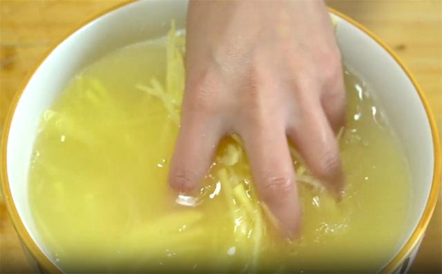 1.大家好,土豆丝一般拿来炒菜,今天分享个用土豆丝做的懒人早餐,六分钟就能出锅,营养好吃还不油腻。先准备两个土豆,把皮去掉切片,再切成丝,想要更省事的话,可以用擦丝器,但是这样切出来的土豆丝比擦出来的口感更好一些,切好以后放进大碗里,加入足量的清水,让土豆丝在里面泡一会儿,把多余的淀粉泡出来。