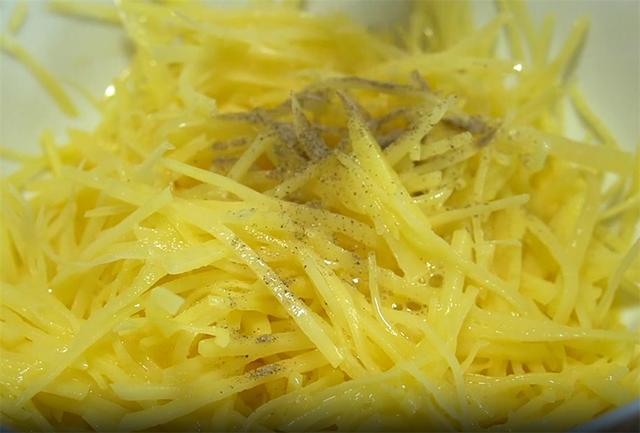 2.土豆丝泡好以后捞出来控一下水分,先装在大碗里,再来调一下味,胡椒粉,适量的盐。