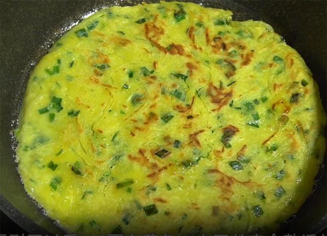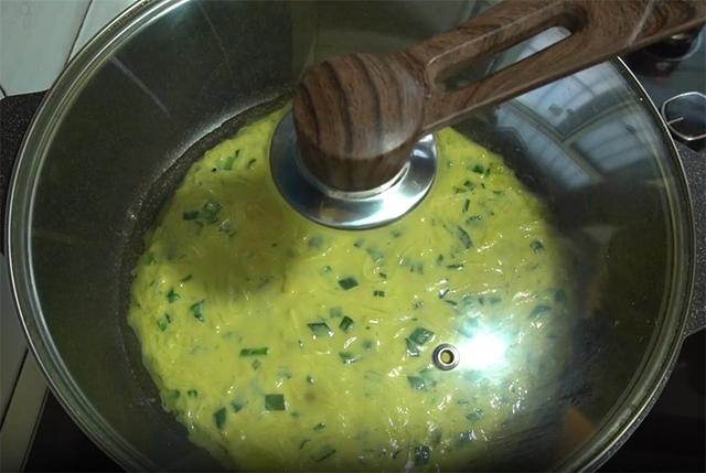 5.先把平底锅烧热,再往里面加点油,把油涂抹均匀,让整个锅底都沾上一层油,再把调好的菜糊全部倒进锅里,用铲子迅速把它推平整,不要太厚,薄一点口感更好,也更容易成熟,盖上盖子小火焖三分钟。