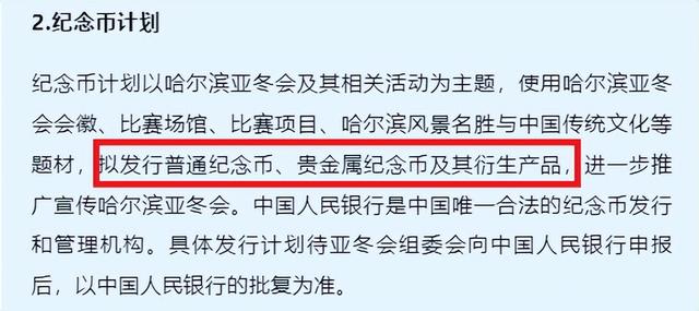 值得关注的是,在2月底,哈尔滨正式公布了亚冬会的市场开发计划,其中的特许经营计划中明确提到,计划为该题材发行普通纪念币、贵金属纪念币以及邮票等。 其中最受关注的,当然就是普通纪念币了。 在计划中,这枚纪念币的设计思路也已经确定,将以亚冬会的会徽、比赛场馆、项目和当地的风景名胜作为币面主题。 何时发行值得一提的是,目前亚冬会纪念币还在筹划阶段,要等央妈的批复,具体的发行时间,自然是还没有的。 可能有部分朋友认为,这枚纪念币要在明年发行。