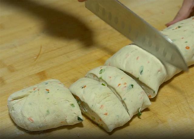 6.发好的面能看到里面都有密集的蜂窝组织,案板上撒点干面粉,把面取出来揉一会儿,排一下里面的空气,然后搓成长条,第一刀切的大一些,后面都切成大小均匀的面剂。