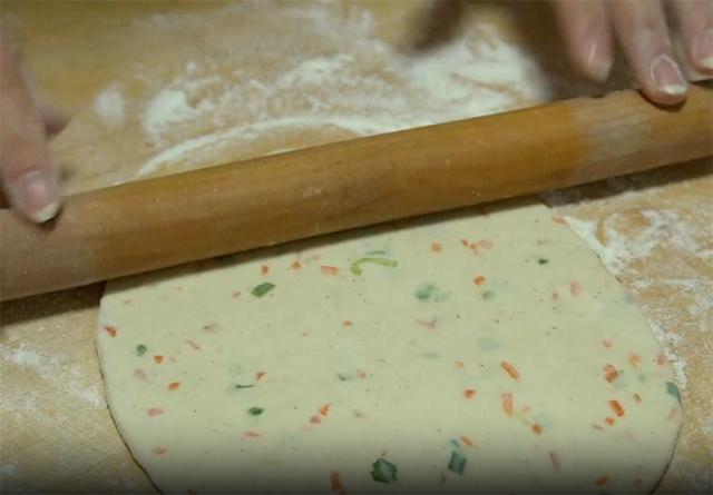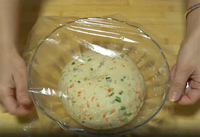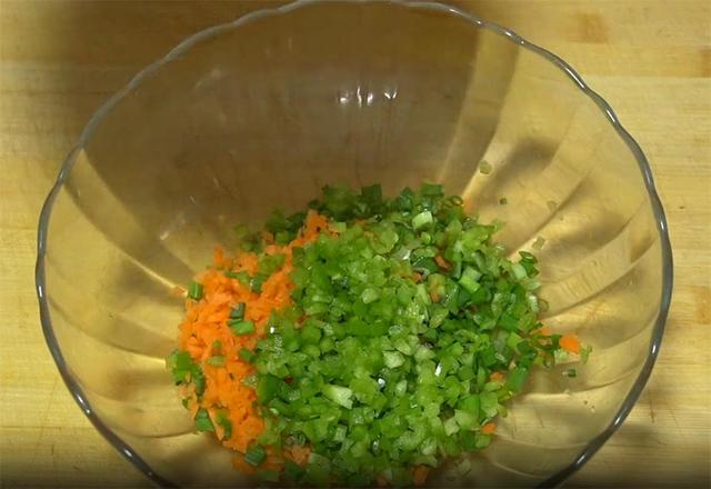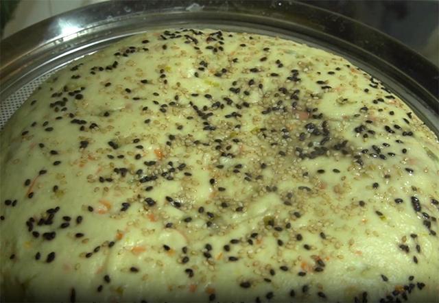 准备食材: 胡萝卜、香葱、青椒、普通面粉、温水、酵母粉、盐、十三香、花生油、清水、熟芝麻 具体做法: