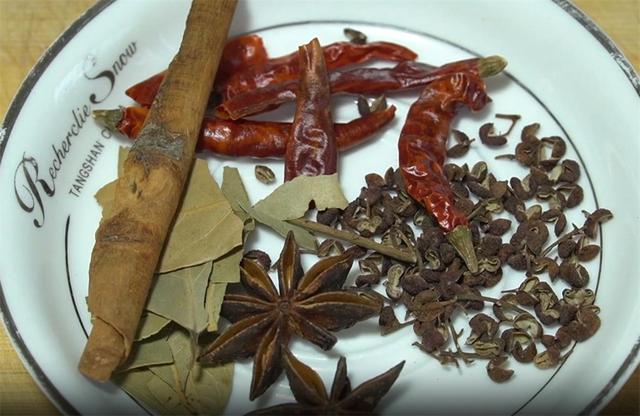 2.准备一些大料,一小把花椒、两个八角、几个干辣椒、几片香叶、一段桂皮,先放一边备用。