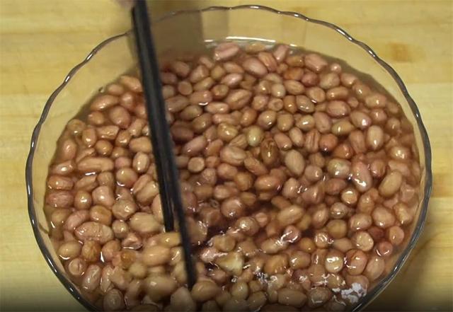1.大家好,今天分享个老爸特别喜欢的经典家常菜菜,也是我们家餐桌上必不可少的小菜。盆里倒入一斤半花生米,加入适量的温水,一小勺盐,把它们浸泡2个小时。