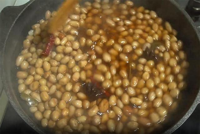 3.花生泡好以后,再用清水冲洗一遍,锅里加入足量的清水,把花生米全部倒进来,提前准备好的大料也倒进来,加入两勺盐调味,煮花生米一定不要用铁锅,不然表面颜色会发黑,大火烧开以后再改小火煮20分钟,时间到了以后关火焖十分钟,然后把煮好的花生全部捞出来备用。