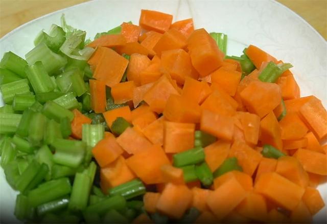 4.准备一把洗干净的芹菜切成小段,一根胡萝卜切片切条,再切成丁备用。