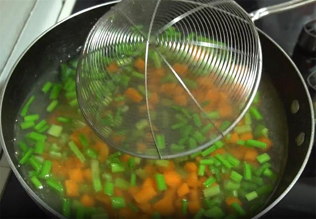 5.锅里水开放几滴食用油,放入胡萝卜和芹菜,把它们一起焯水一分钟,然后捞出来过下提前准备的凉开水,泡凉以后就捞出来,不要一直在里面泡着。