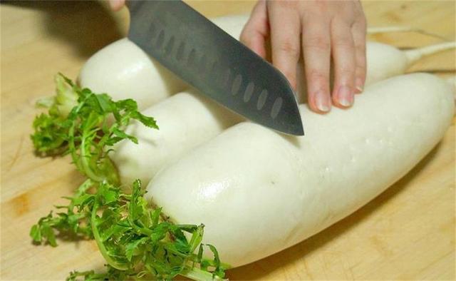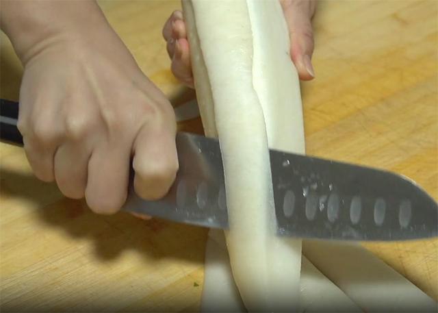 1.大家好,今天分享一个简单快速的开胃小菜,准备三根白萝卜,先清洗干净,再把头和尾去掉,今天咱们只用萝卜皮的部分,少带点果肉的部分口感更好。