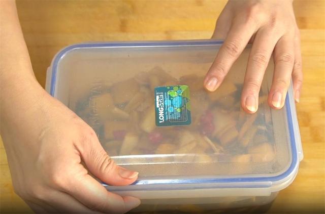 6.然后装在一个干净没有生水生油的保鲜盒里,放冰箱冷藏腌制一个晚上。