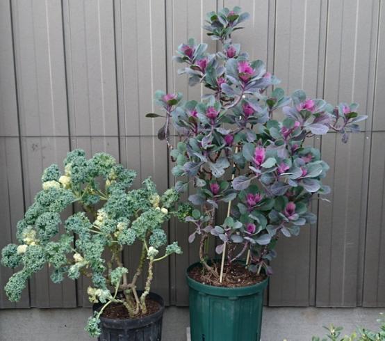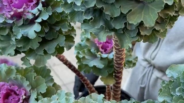 2、羽衣甘蓝老桩养成 大妈已经开始仅仅是把羽衣甘蓝种在小菜园里,但随着羽衣甘蓝越长越高,大妈就动了心思,觉得是不是可以修剪一下,慢慢养出一个形状出来,想到这里大妈立马就行动了,凭借着多年的养花,种菜的功力,羽衣甘蓝的老桩就这么慢慢养成了! ①抽花葶 春季的时候,羽衣甘蓝会开花,等到花谢之后,需要剪掉花穗,保留抽出的花葶,这是让植株拔高,逐渐形成老桩的关键! ②养花芽 在剪掉花穗之后,进行浇水施肥等工作,就会发现,花葶上会陆陆续续生出一些小花芽,这些花芽要好好养护,如果出了很多,就需要出弱留强,抽稀,做造型等来保留最合适的花芽! ③调姿态 培育出有用的花芽之后,就可以把下部的枯黄的老叶片给摘除了,这样就可以根据自己的喜欢,来调整整个植株的姿态,让你得到一个老桩的基础了,剩下来的就是交给时间,此起彼伏的养个几年,就成了你想要的老桩了!