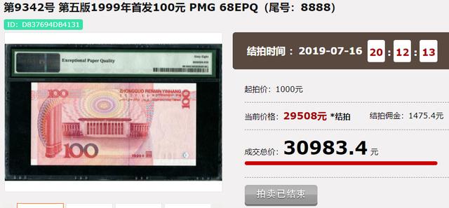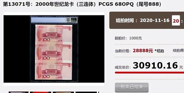 这种纸币中,只是末尾4个数字相同的狮子号,也能拍出3万多! 而无论是世纪龙卡还是首发币,它们本身都已经要好几千了。 从中,我们也能看出,豹子号或者相近的靓号,它们必须在本身就十分珍贵的纸币中,才能体现额外的收藏价值。