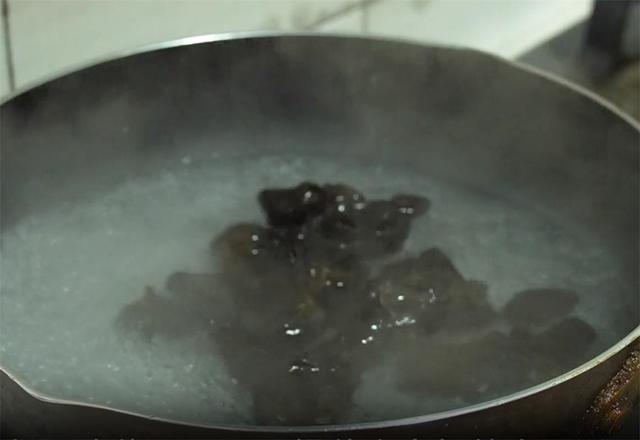 8.锅里水烧开,下入提前泡发好的木耳,把木耳焯水三分钟,然后捞出来过一下凉水,泡凉以后用力挤一下水分备用。