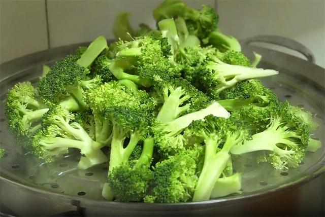 7.现在西兰花的颜色翠绿翠绿的,直接把蒸篦取出来,放一边备用。