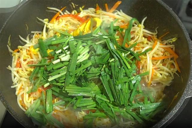 5.锅里油热,加入葱姜和辣椒,先把香味炒出来,再把萝卜丝倒进来,开大火把萝卜丝炒到稍微变软,下入洗净的一把绿豆芽,这时候先不要着急倒入料汁,放早了豆芽容易出水,炒出来口感也不脆,翻炒一分钟以后,再把料汁倒进来,还有切好的韭菜,大火翻炒半分钟就可以装盘了。