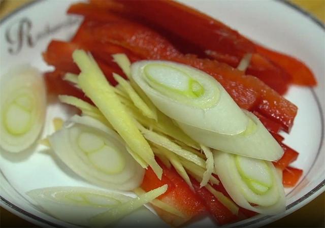 3.准备适量大葱切成段,生姜切成丝,红椒切成丝备用。