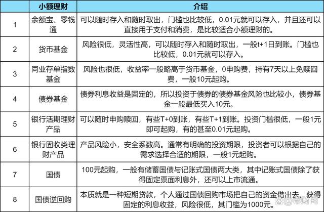 1、余额宝和零钱通:灵活性是比较好的,可以随时存入和随时取出,门槛也比较低,0.01元就可以存入,并且还可以直接用于支付和消费,是比较适合小额理财的。 2、货币基金 风险很低,灵活性高,可以随时存入和随时取出,一般t 1日到账。门槛也比较低,0.01元就可以存入。 3、同业存单指数基金 80%以上的基金资产投资于AAA级同业存单,因为同业存单有固定的利息收入,所以同业存单基金的风险也很低,收益率一般略高于货币基金,在3%左右。0申购费,持有7天以上免赎回费,一般10元起购。 4、债券基金 指80%以上的基金资产投资于国债、金融债、企业债等债券的基金,其基金收益主要由投资的债券决定。债券的收益主要来自债券的利息收入和债券买卖的价差收入,而债券利息收益是固定的,所以投资于债券的债券基金风险也比较小。债券基金一般最低买入10元。 5、银行活期理财产品 可以随时申购赎回,有些T 0到账,有些T 1到账。投资门槛很低,一般1元即可起购,有的甚至0.01元起购。 例如建设银行的恒赢按日开放式产品、惠众日申季赎开放式产品,招商银行的朝朝宝等,门槛也是很低的,1元就可以起购,可以随时赎回,风险也比较低。