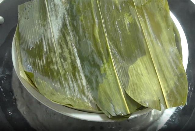 9.最后再铺上一层糯米,上面铺上粽叶,想要造型更好看一些,可以用剪刀修剪一下粽叶,凉水放进蒸锅,开大火,水开后再蒸20分钟。