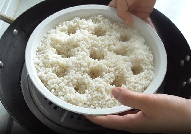 4.现在糯米已经蒸好了,往糯米里加入能和糯米持平的开水,记住一定要用开水盖上盖子,继续大火蒸20分钟。