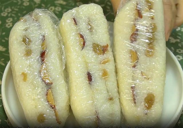 11.闻起来真的好香,有糯米香、粽叶香,还有大枣的香味,还可以把它切成块,如果喜欢吃甜的,上面撒上白糖,一次可以多做点,把它们分成块,用保鲜膜包起来,放冰箱冷藏吃一周都没问题。